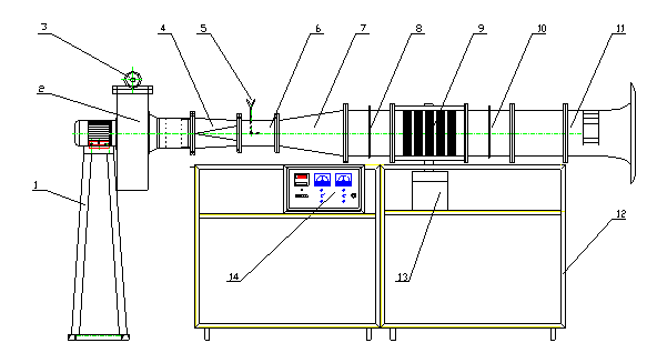 1.風(fēng)機支架 2.風(fēng)機 3.風(fēng)量調(diào)節(jié)手輪 4.過渡管 5.測壓管 6.測速段 7. 過渡管 8.管簇后測壓管 9.實驗管段 10. 管簇前測壓管 11.吸入管 12.支架 13. 加熱元件 14.控制盤