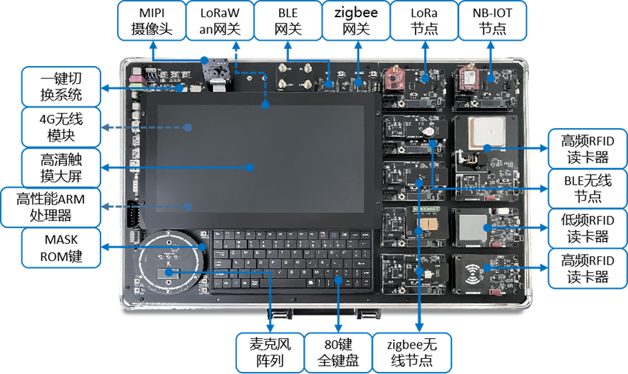 整個(gè)教學(xué)平臺(tái)包括物聯(lián)網(wǎng)、嵌入式Linux和人工智能(AI),三個(gè)部分互相支撐、互為補(bǔ)充。人工智能部分的硬件基于嵌入式ARM控制器、高清相機(jī)模塊、7麥麥克風(fēng)陣列,具備語音、圖像數(shù)據(jù)的采集和處理能力及適用于多種場景的控制接口;嵌入式Linux部分的硬件采用CPU+GPU雙處理器架構(gòu),配備高清大屏以及豐富的外設(shè)接口;物聯(lián)網(wǎng)部分的硬件支持RFID、Zigbee、Ble、Lora、NBIoT等無線傳輸技術(shù)以及20余種傳感器模塊。