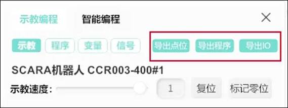 示教面板上方“導(dǎo)出點位”、“導(dǎo)出程序”“導(dǎo)出I0”按鈕,分別支持對當(dāng)前點位表、程序、10的導(dǎo)出。