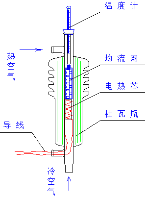 氣體的流量由節(jié)流閥控制,氣體出口溫度由輸入電熱器的功率來調(diào)節(jié)。