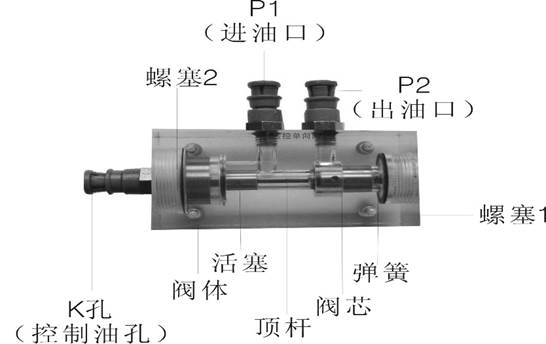 2、溢流閥結(jié)構(gòu)上參考了國(guó)產(chǎn)P-63B型低壓直動(dòng)式溢流閥,其閥體、閥蓋、鎖緊螺母、調(diào)節(jié)螺母、螺塞等采用了進(jìn)口透明有機(jī)玻璃材料精制而成,閥芯、調(diào)節(jié)桿采用了45#中碳鋼材料。并配合彈簧,油接頭,密封圈等標(biāo)準(zhǔn)件裝配而成,通過它可明確地觀察到閥芯、彈簧、油孔等結(jié)構(gòu)及其運(yùn)行過程,具有形象逼真,性能可靠等優(yōu)點(diǎn)。它既可作為教學(xué)模型,也可作為液壓實(shí)驗(yàn)元件進(jìn)行實(shí)驗(yàn)演示。