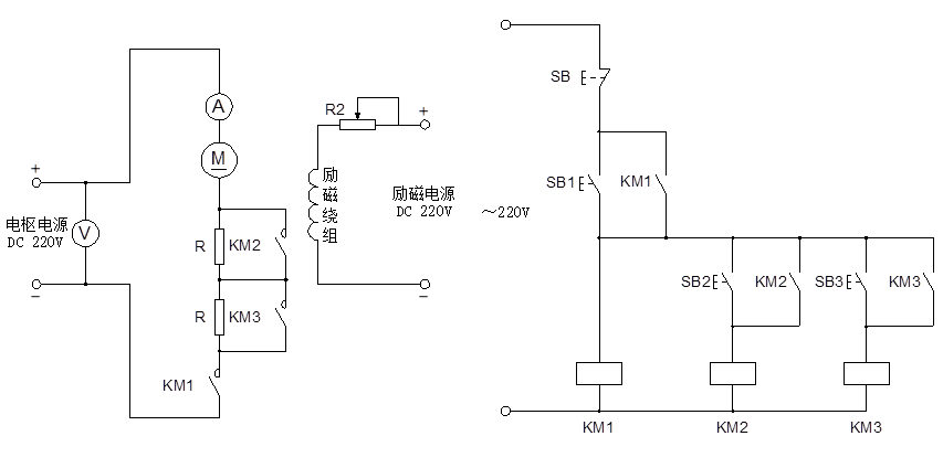 除以上用時間繼電器控制直流電動機(jī)的調(diào)速外,還可以用繼電接觸器控制電機(jī)的調(diào)速,電路圖如下,試分析其工作過程: