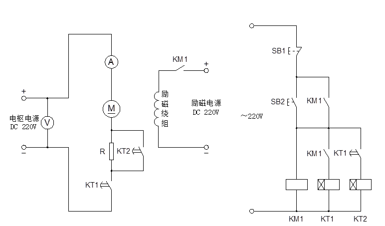 按下控制屏上的“啟動”按鈕,將電樞電源開關(guān)打在開的位置,調(diào)節(jié)電樞電源的“電壓調(diào)節(jié)”旋鈕,使直流電壓輸出為220V;將時間繼電器KT1和KT2都設(shè)定為3S,按下“停止”按鈕。按圖5-2接線,交流220V接至控制屏的固定輸出端U1和N1。R為DQ29上90Ω阻值(2個90Ω串聯(lián)為180Ω阻值),測量儀表選用DQ22上電壓表300V檔和安培表5A檔,電機(jī)用DQ09。檢查接線電路,無誤后按下面步驟操作: