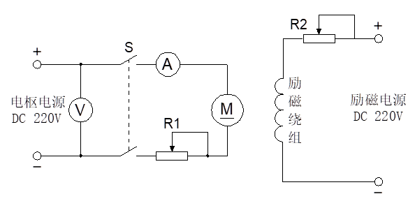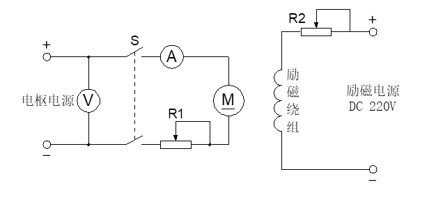 按下控制屏上的“啟動”按鈕,打開電樞電源開關(guān),調(diào)節(jié)電樞電源的“電壓調(diào)節(jié)”旋鈕,使直流電樞電壓輸出為220V,按下“停止”按鈕。按圖5-5接線,圖中電阻R1為DQ29上180Ω并將其為最大位置,R2為DQ29上1800Ω阻值并將其置最小位置,S選用屏上雙刀雙擲開關(guān),開始時處于斷開狀態(tài)。