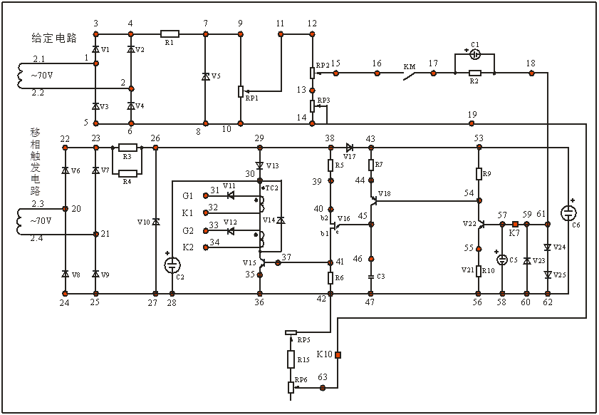 該電路中給定電壓與電壓負反饋和電流正反饋的偏差控制V22輸出電壓的大小,從而控制電流的大小,從而實現(xiàn)脈沖移相。