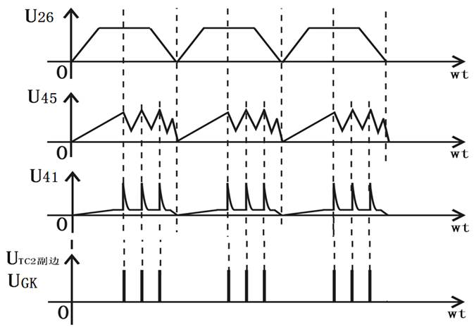 由變壓器TC1副邊輸出約70V±10%的交流同步電壓,經(jīng)V6~V9橋式全波整流,再由穩(wěn)壓管V10進行削波,從而得到梯形波電壓,其過零點與電源電壓的過零點同步,梯形波通過R7、R9、V18及V22組成的恒流源向電容C3充電,當充電電壓達到單結(jié)晶體管V16的峰值電壓UP時,單結(jié)晶體管V16導通,同時由于放電時間常數(shù)很小,C3兩端的電壓很快下降到單結(jié)晶體管的谷點電壓Uv,使V16關(guān)斷,C3再次充電,周而復始,在電容C3兩端呈現(xiàn)鋸齒波形,在脈沖變壓器副邊輸出尖脈沖。在一個梯形波周期內(nèi),V16可能導通、關(guān)斷多次,但對晶閘管的觸發(fā)只有第一個輸出脈沖起作用。然后脈沖經(jīng)V15進行功率放大,再經(jīng)過脈沖變壓器TC2便可在TC2副邊得到兩組相位一致的脈沖。