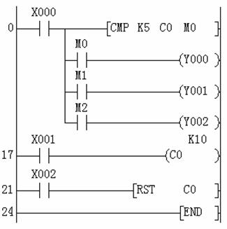 (4)例程說明:當(dāng)計數(shù)器C0的值:小于5時,M0輸出ON;等于5時,M1輸出ON;大于5時,M2輸出ON。