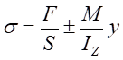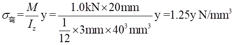 但是,當(dāng)載荷加載到了試件的A-A截面時(shí),試件橫截面上由此產(chǎn)生的正應(yīng)力分為兩部分,其一是拉力F引起的拉伸應(yīng)力,另一部分是彎曲引起的正應(yīng)力。因此當(dāng)載荷加載在A-A截面上時(shí),試件橫截面上的正應(yīng)力為: