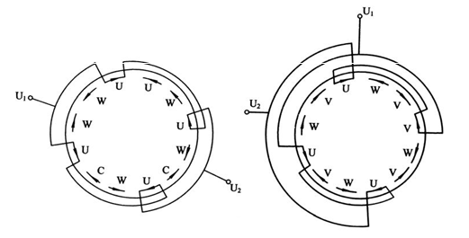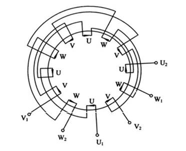 ② 用不同的顏色區(qū)分頭尾,且用 U1、V1、W1 標明繞組的始端,U2、V2、W2 標明繞組的末端。