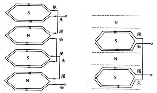 · 極相組的連接。在一個極下的,屬于同一相的所有線圈串聯(lián)在一起,稱為一個極相組。為了保證三相電動機線圈連接之后,能形成 N 極和 S 極相間的排列,各極相組之間的連接,必須是頭頭相拉,如圖 5-1(a)所示。但也有如圖 5-1(b)所示的頭尾相接,這時可以看到,同樣是四極三相電動機,它只有兩個極相組,因而它必須是頭尾相接,才能形成四極的磁場,但此種接法通常用于單繞組多速三相電動機。在中小型電動機中,一個極相組內(nèi)的線圈一般是連續(xù)繞制的,因此不用接頭。