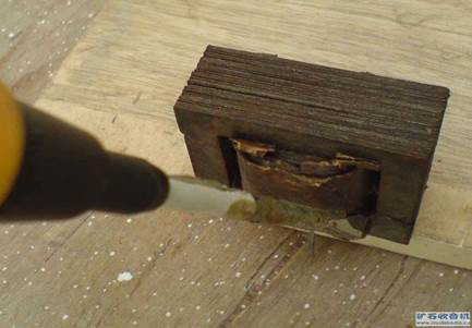 1把變壓器夾在臺虎鉗上面,不是全夾,夾住大部分,留出若干片鐵心(至少3--5片)不夾。沒有臺鉗,可以找塊木版,把變壓器放在上面,邊緣也是留出幾片鐵心的位置懸空。如圖1-2。