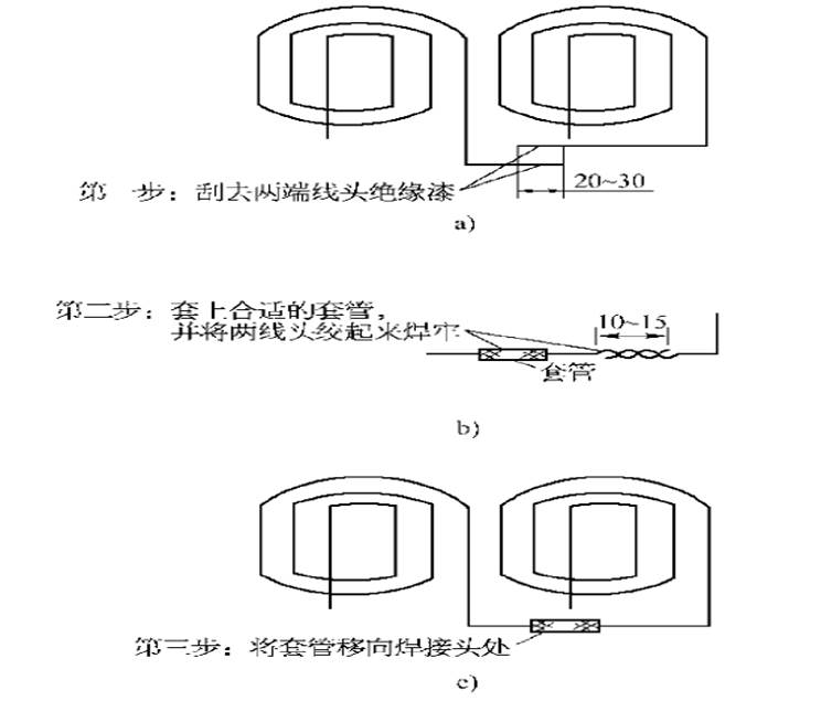 一般焊接時,先將兩根待焊的導(dǎo)線留以適當(dāng)?shù)拈L度,并將導(dǎo)線線頭絕緣漆刮去,長度約15—30mm,然后將兩根導(dǎo)線緊緊地絞在一起用錫焊牢。錫焊部分長度不少于l0mm。焊口用20一30mm的蠟套管或聚氯乙烯套管套好。具體操作分為了步,如下圖所示。