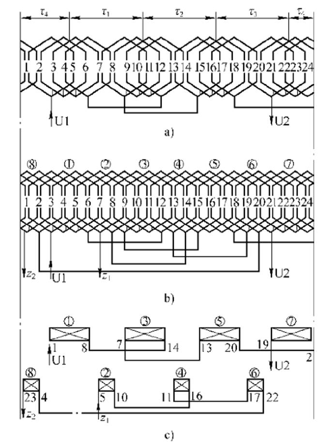 單相雙層短距繞組的嵌線方法,同三相雙層短距繞組完全一樣現(xiàn)以2p=4,Q1=24槽為例,說明嵌線方法。