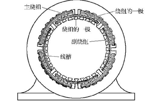 定子結(jié)構(gòu)有兩種形式。較大功率的采用和三相異步電動機(jī)相似的結(jié)構(gòu),定子鐵心也是用硅鋼片沖壓而成。鐵心槽內(nèi)放置有兩套繞組,一套是主繞組,也稱工作繞組,另一套是副繞組。俗稱起動繞組(內(nèi)總槽的1/3)。兩種繞組一般采用同心式繞組,其軸線在空間相隔90度電角度。功率較小的定子鐵心制成凸極形狀,磁極的一部分被短路環(huán)罩住,凸極上裝有主繞組,一般為集中式繞組。