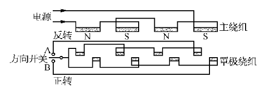在隱極式罩極電動機(jī)中,可以正反方向運轉(zhuǎn),這種可逆電動機(jī)的定子槽中必須具有一套主繞組與兩套罩極繞組,其極數(shù)相同。當(dāng)電動機(jī)朝一個方向旋轉(zhuǎn)時,只有一套罩極繞組起作用。