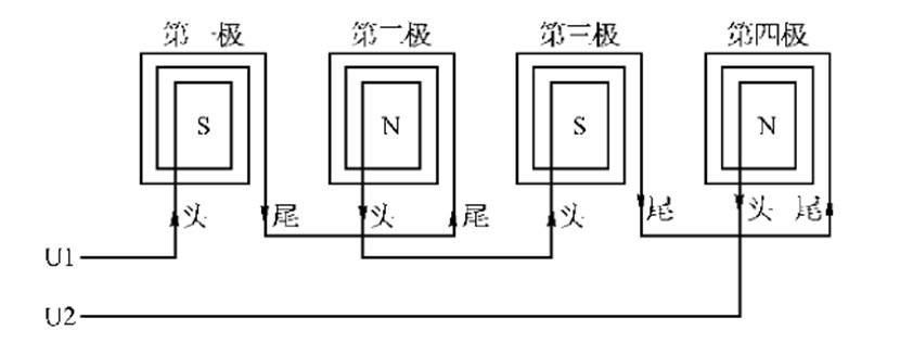 (2)不管電動機(jī)的極數(shù)有多少,同一繞組相鄰兩磁極的極性必須是相反的。所以兩相鄰線圈組的接法是,在串聯(lián)接線時應(yīng)當(dāng)是“反串聯(lián)”,即“頭—頭”連接或“尾—尾”連接。