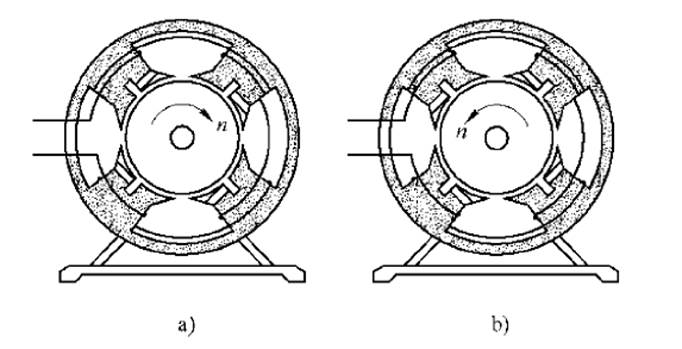 罩極電動機(jī)的轉(zhuǎn)向,是從主繞組軸線轉(zhuǎn)向罩極繞組軸線的,如果要改變普通罩極電動機(jī)的旋轉(zhuǎn)方向.就只要將電動機(jī)拆開,把定子或轉(zhuǎn)子反向安裝.如圖下a所示,是沿順時針方向旋轉(zhuǎn)的電動機(jī)。而圖b只是將定子鐵心反向安裝,則電動機(jī)沿逆時針方向旋轉(zhuǎn)。