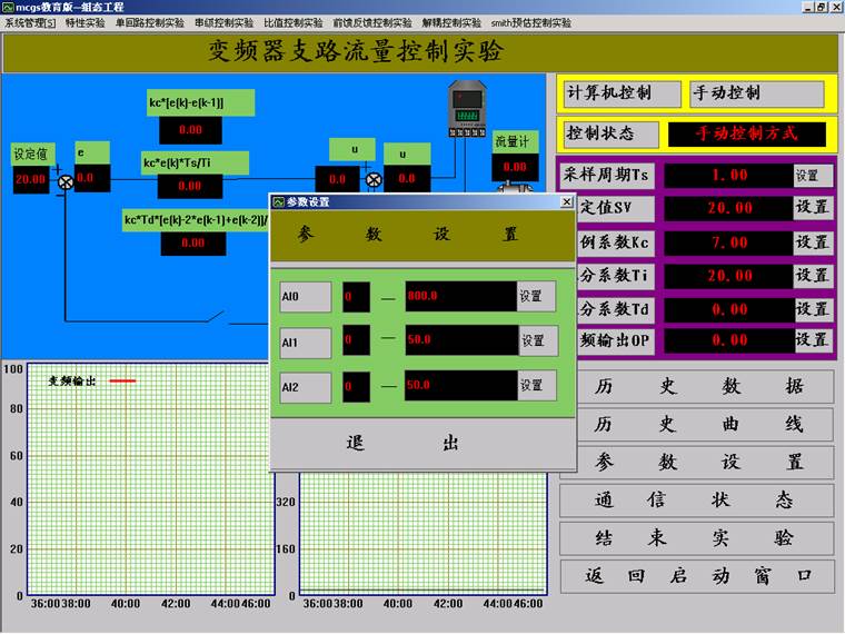 6.點擊“確認”,用戶登錄完畢。選擇“單回路控制實驗”下拉菜單中的“變頻器支路流量控制實驗”,出現(xiàn)如下的“變頻器支路流量控制實驗”界面。