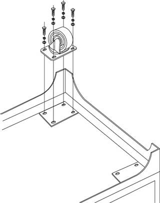 ② 將桌體翻轉(zhuǎn),圍板與萬向輪一同安裝到實驗臺桌身,注意孔位對齊。按照右圖所示
