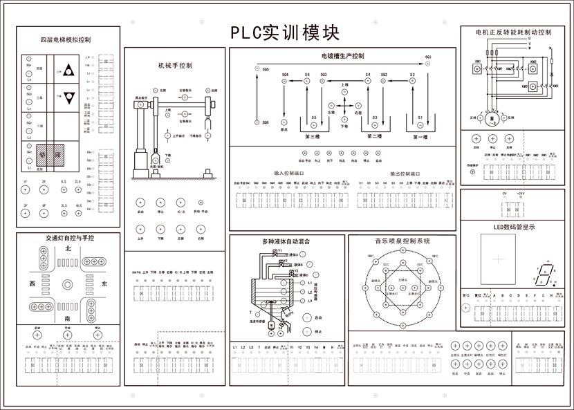 PLC實訓(xùn)模塊是由LED指示燈和按鈕開關(guān)組成的控制模擬單元,每個單元都有不同的實訓(xùn)內(nèi)容,模擬了不同的工業(yè)現(xiàn)場,其工作電壓為DC24V,實驗導(dǎo)線連接如如例所示