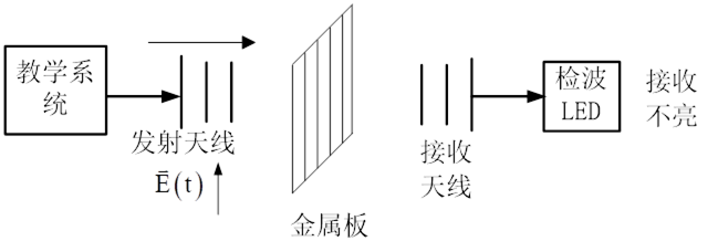 3)將垂直縫隙柵格平面金屬板放入收發(fā)天線中間,觀察LED燈是否被點(diǎn)亮。按下發(fā)射開關(guān),此時電磁波發(fā)射出來,觀察LED燈是否被點(diǎn)亮,因為不滿足邊界條件LED燈不亮。