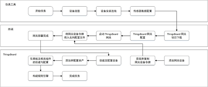 智慧溫室案例,引入了ThingsBoard IoT Gateway開源解決方案,在AIoT平臺的仿真工具中部署ThingsBoard gateway網(wǎng)關,以連接ThingsBoard云平臺,便于上送溫濕度傳感器數(shù)據(jù),搭建恒溫機執(zhí)行器模塊;赥hingsBoard平臺,用戶可在儀表盤內添加設置智慧溫室場景、溫濕度顯示設備等組件,獲取仿真實驗中上送的虛擬數(shù)據(jù),以動態(tài)曲線的形式作可視化呈現(xiàn);用戶還可根據(jù)案例要求,在ThingsBoard平臺的規(guī)則鏈庫中,自主編輯設定規(guī)則引擎,實現(xiàn)智慧溫室的恒溫控制與異常告警。
