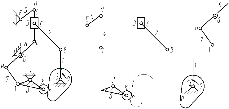 如圖4所示機(jī)構(gòu),可先除去K處的局部自由度;然后,按步驟2)計(jì)算機(jī)構(gòu)的自由度F = 1,并確定凸輪為原動(dòng)件;最后根據(jù)步驟3)的要領(lǐng),先拆分出由構(gòu)件4和5組成的Ⅱ級(jí)組,再拆分出由構(gòu)件3和2及構(gòu)件6和7組成的兩個(gè)Ⅱ級(jí)組及由構(gòu)件8組成的單構(gòu)件高副桿組,最后剩下原動(dòng)件1和機(jī)架9。