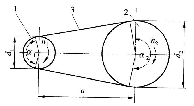 摩擦型帶傳動通常由主動輪、從動輪和傳動帶組成。傳動帶以一定的初拉力F0緊套在帶輪上,在F0的作用下,帶與帶輪的接觸面間產(chǎn)生正壓力,當主動輪1回轉(zhuǎn)時,接觸面間產(chǎn)生摩擦力,主動輪靠摩擦力使傳動帶3與其一起運動。同時,傳動帶靠摩擦力驅(qū)使從動輪2與其一起轉(zhuǎn)動,從而主動軸上的運動和動力通過傳動帶傳遞給了從動軸。