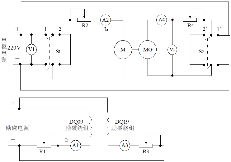按圖4-1接線,圖中M用編號為DQ09的直流并(他)勵電動機(jī)(接成他勵方式),MG用編號為DQ19的校正直流測功機(jī),直流電壓表V1、V2的量程為300V,直流電流表A1、A3的量程為200mA,A2、A4的量程為5A。R1、R2、R3、及R4依不同的實訓(xùn)而選不同的阻值。
