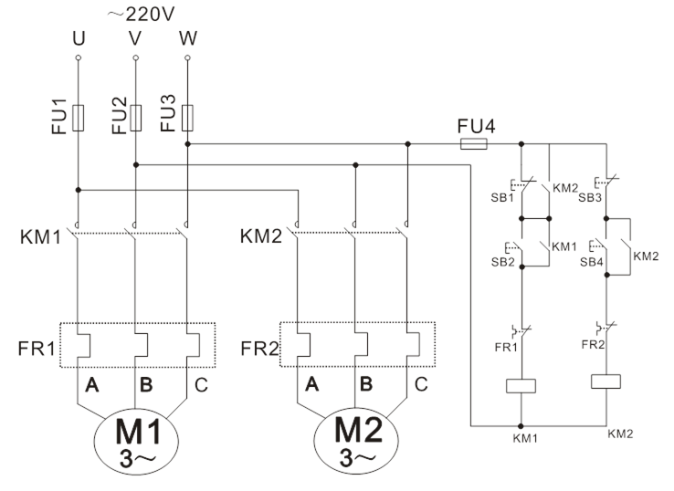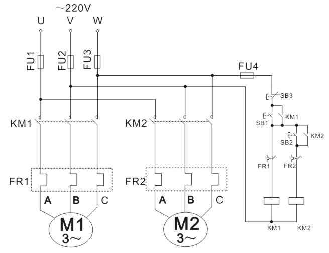 (5)在M1與M2都運行時,按下SB3,觀察并記錄電機及接觸器運行狀態(tài)。