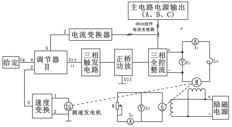 三相220V交流電A相,B相,C相經(jīng)過DK06上的“電流互感器”對(duì)應(yīng)連接到DK03上的主電路輸入,電流變換器的輸出“TA1、TA2、TA3”無需接(內(nèi)部已接到電路板),把電流變換器的電流反饋輸出端“2”接到“調(diào)節(jié)器Ⅱ”的輸入端“5”,從零開始逐漸調(diào)大“給定”電壓Ug,使電動(dòng)機(jī)的轉(zhuǎn)速接近n=l200r/min;由小到大調(diào)節(jié)直流發(fā)電機(jī)負(fù)載I,使主回路電流升至1A。調(diào)整電流反饋單元(FBC+FA)中的電流反饋電位器RP1,使電流反饋電壓“If”逐漸升高直至將“調(diào)節(jié)器Ⅱ”的輸入端“5”連接的穩(wěn)壓管擊穿,此時(shí)電動(dòng)機(jī)的轉(zhuǎn)速會(huì)明顯降低,說明電流截止負(fù)反饋環(huán)節(jié)已經(jīng)起作用。IN即為截止電流。停機(jī)后可突加給定啟動(dòng)電動(dòng)機(jī)。