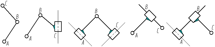 最簡單的桿組為n = 2, P5 = 3,稱為Ⅱ級組,由于桿組中轉動副和移動副的配置不同,Ⅱ級桿組共有如下五種形式: