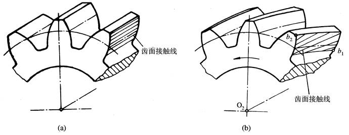 直齒圓柱齒輪嚙合時(shí),輪齒接觸線是一條平行于軸線的直線,并沿齒面移動(dòng),如圖4-1(a)所示。 所以在傳動(dòng)過程中,兩輪齒將沿著整個(gè)齒寬同時(shí)進(jìn)入嚙合或同時(shí)退出嚙合,因而輪齒上所受載荷也是突然加上或突然卸下, 傳動(dòng)平穩(wěn)性差,易產(chǎn)生沖擊和噪聲。