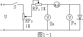 將RP2和作限流作用的RP1阻值調(diào)至最大位置,穩(wěn)壓電源輸出電壓調(diào)至5V,合上開關(guān),分別調(diào)節(jié)RP1和RP2,觀察不同正向電壓UF時(shí)流過(guò)二極管的電源和該管兩端的電壓PV。