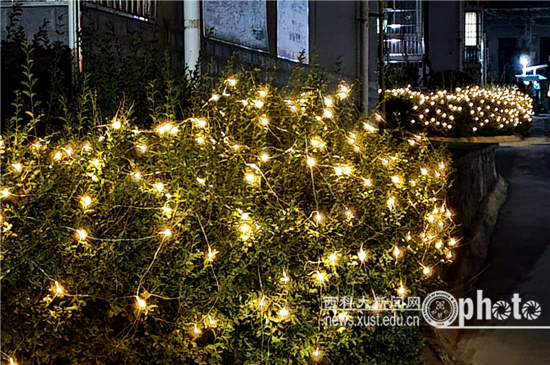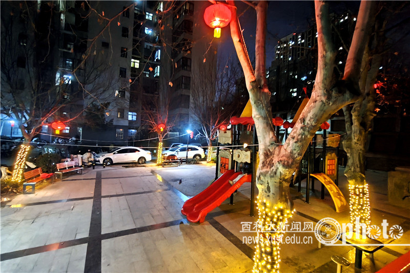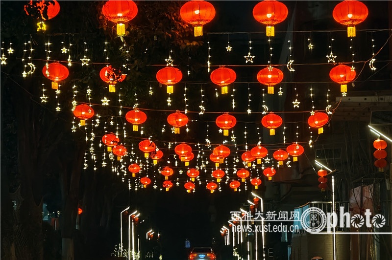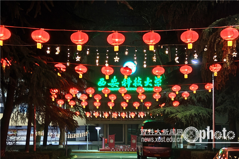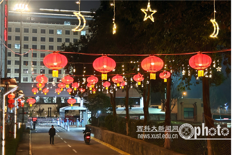 在雁塔校區(qū),鼓舞人心的新春對聯張貼在大門兩側,祝福師生新春快樂的主題造型迎門而立。主干道上張燈結彩,高掛的大紅燈籠與行道旁的青松翠柏相映成趣。尤其是在夜幕下,路旁的燈串閃爍,營造出璀璨動人的夜色;紅燈籠點亮的“連廊”,吸引著師生們紛紛駐足欣賞。極具中國韻味的年節(jié)裝扮,盡顯中華優(yōu)秀傳統文化的底蘊。裝扮一新的校園與校外車水馬龍的街道交相輝映,為古城新春平添了節(jié)日的色彩。