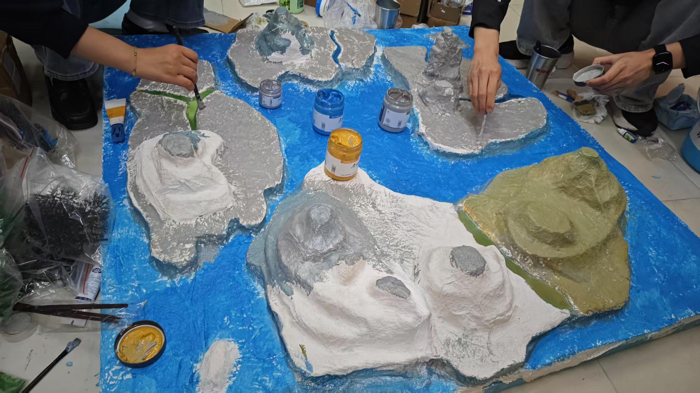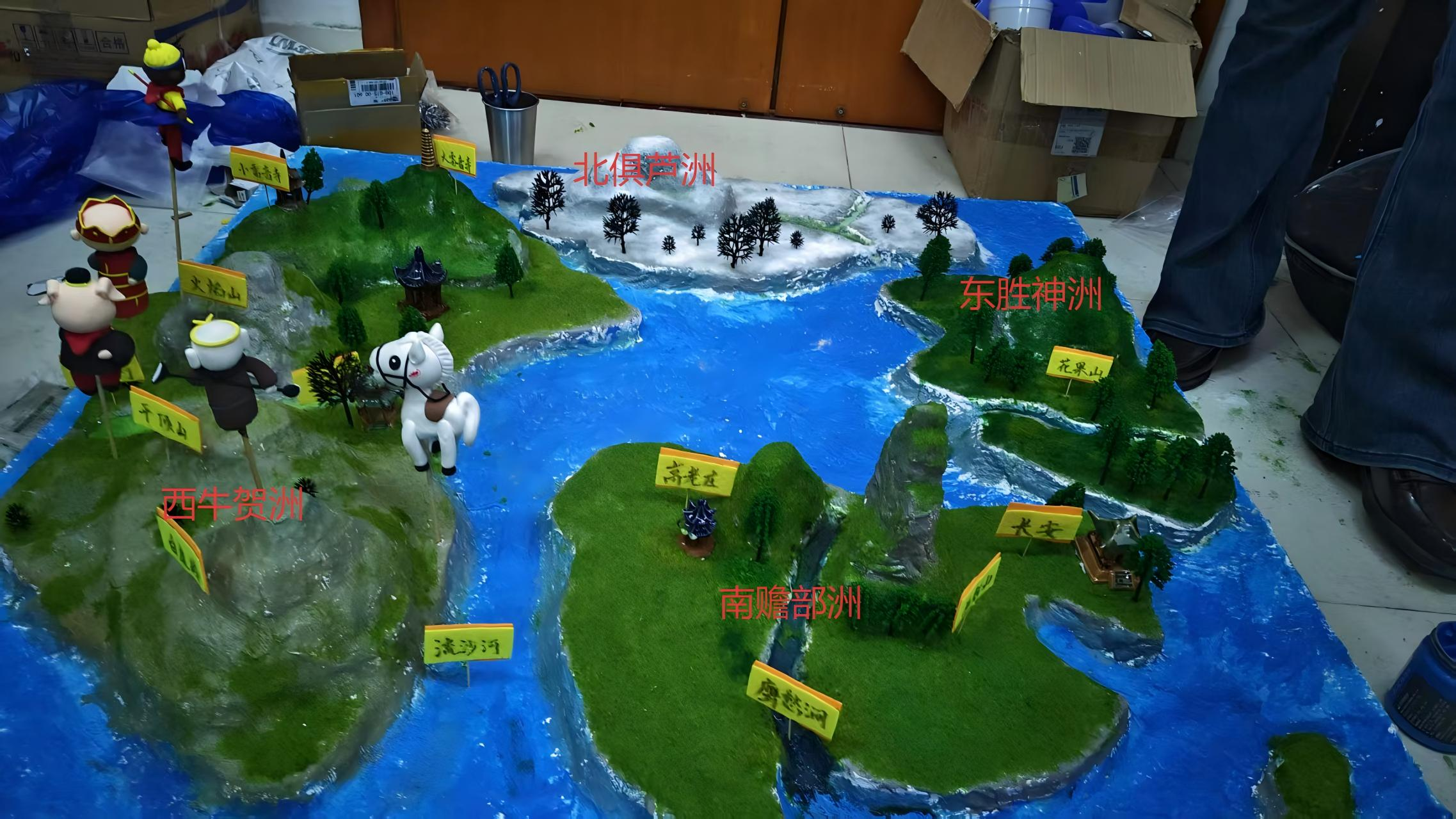 來自不同院系的三位同學(xué)周柯宇、王玲瓏、李嘉興共同制作的“西游記”沙盤(上圖)及制作過程