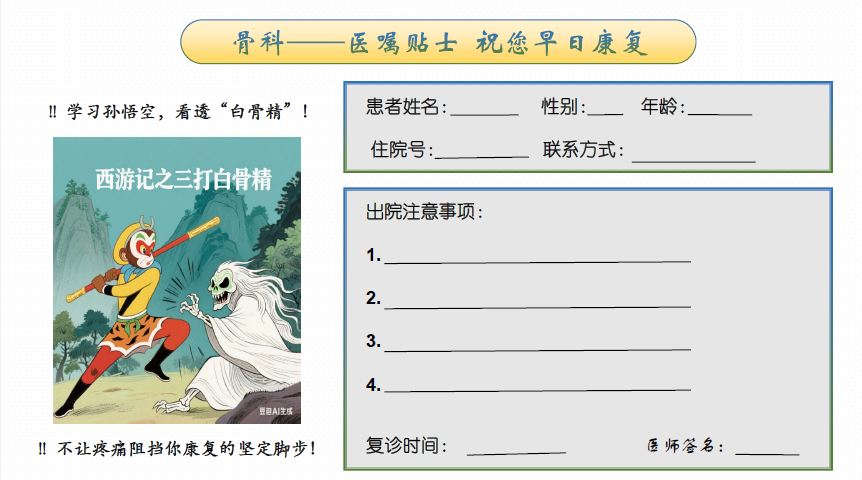 姜沐含是醫(yī)學(xué)部臨床醫(yī)學(xué)專業(yè)的學(xué)生,作為醫(yī)學(xué)生,她提交的期中作業(yè)是別致的“西游記”主題醫(yī)囑卡片和制作精美的“西游記”主題醫(yī)學(xué)科普宣傳手冊(cè)。在醫(yī)囑卡和宣傳冊(cè)中,她將唐僧與孫悟空師徒四人西天取經(jīng)、斬妖除魔的故事化作患者與各類病魔抗?fàn)幍纳鷦?dòng)隱喻:“烏雞國(guó)王被陷害后復(fù)活”的故事在宣傳手冊(cè)中對(duì)應(yīng)著心肺復(fù)蘇術(shù)在現(xiàn)實(shí)生活中讓人起死回生的醫(yī)學(xué)案例、師徒四人與白龍馬的團(tuán)隊(duì)被描摹成各自發(fā)揮特色的多學(xué)科聯(lián)合治療團(tuán)隊(duì)……生動(dòng)的卡通形象與嚴(yán)肅的醫(yī)學(xué)知識(shí)相映成彰,對(duì)西游記作品的“切磋琢磨”也體現(xiàn)了創(chuàng)作者將傳統(tǒng)文化IP與現(xiàn)代醫(yī)學(xué)相融合的智慧丹心。