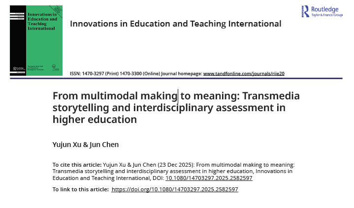 2025年12月23日,浙江大學(xué)傳媒與國(guó)際文化學(xué)院徐玉雋研究員與北京大學(xué)藝術(shù)學(xué)院教授陳均合作論文《從多模態(tài)創(chuàng)作到意義生成:跨媒介敘事與高等教育中的跨學(xué)科評(píng)價(jià)》(“From multimodal making to meaning: Transmedia storytelling and interdisciplinary assessment in higher education”)在《國(guó)際教育與教學(xué)創(chuàng)新》(Innovations in Education and Teaching International)發(fā)布。