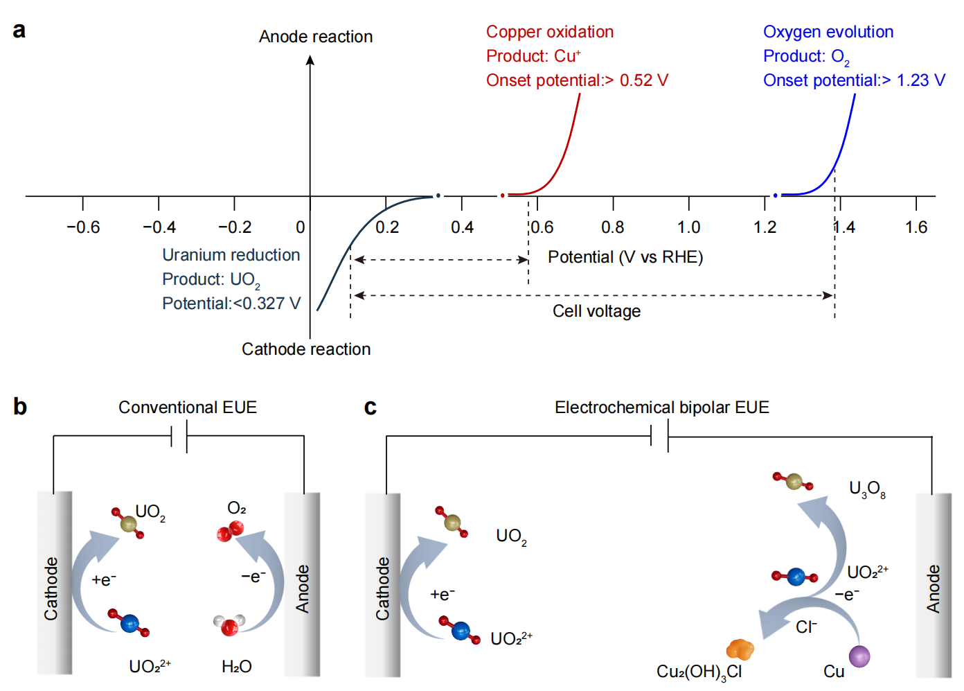 傳統(tǒng)電化學(xué)提鈾(EUE)和雙極EUE方法的示意圖。a, 不同陽極反應(yīng)電位耦合陰極EUE體系;b, 傳統(tǒng)EUE方法示意圖;c, 雙極EUE方法示意圖。