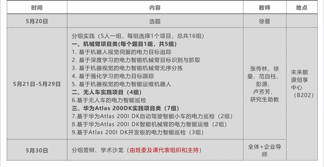 本次選題采用“軟件+硬件+AI+能源電力”結(jié)合的模式。在前序課程《人工智能技術(shù)及電力系統(tǒng)應(yīng)用》中,學(xué)生已經(jīng)分組開展初步實踐,實現(xiàn)了“AI+電力”的軟件設(shè)計或相關(guān)算法,在此次課程中所有選題均增加“硬件”模塊。根據(jù)硬件的類別,分為機械臂項目類、Appolo無人車類、華為開發(fā)板類三大類,其在能源電力場景的應(yīng)用包括電力智能巡檢系統(tǒng)、電力智能運維系統(tǒng)兩大類,三類硬件九個實踐題目,覆蓋兩大能源電力應(yīng)用場景。