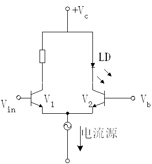 圖6.3所示為LD數(shù)字調(diào)制原理圖以及LD的射極耦合驅(qū)動電路。V1、V2組成一個電流開關(guān),數(shù)字電信號Vin從V1的基極輸入,Vb是直流參考電壓施加在V2的基極上。當(dāng)信號為“0”碼時,V1的基極電位高于V2的基極電位,電流源全部電流流過V1的集電極,LD接在V2上不發(fā)光,故LD不發(fā)光,相當(dāng)于發(fā)“0”碼。反之,當(dāng)信號為“1”碼時,V2基極電位高于V1基極電位時,則反過來V2導(dǎo)通,全部電流源電流流過V2的集電極支路,對應(yīng)于發(fā)一個“1”碼。
