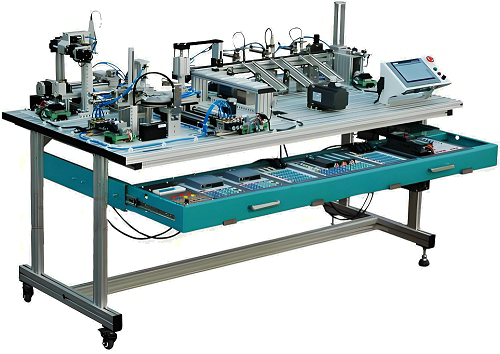平臺采用鋁合金型材結(jié)構(gòu),配有井式供料單元、皮帶傳送與檢測單元(含變頻器)、行走機械手搬運單元、載貨臺單元、平面?zhèn)}儲單元、鉆銑加工單元(含伺服電機)、多工位裝配單元、彩色觸摸屏單元、控制器單元1、控制器單元2、控制器單元3、工業(yè)以太網(wǎng)交換機單元、編程器單元等十多個工作單元。平臺中的工作單元采用機電集成式設(shè)計,每個單元中所涉及的各個傳感器、電機、電磁閥等傳感器和執(zhí)行器的安裝部件和接口單元獨立地匯集成一體,同一個工作單元中各個器件通過標準接口再與控制器進行連接,這樣便于模塊和工作單元之間的靈活組合,教師及學生可自行設(shè)計不同的課題對平臺的各單元進行重新組合,也可自行開發(fā)被控單元與平臺配合使用。